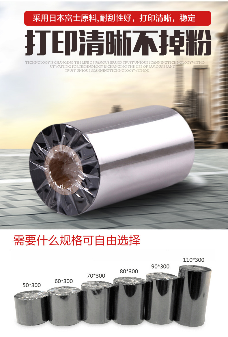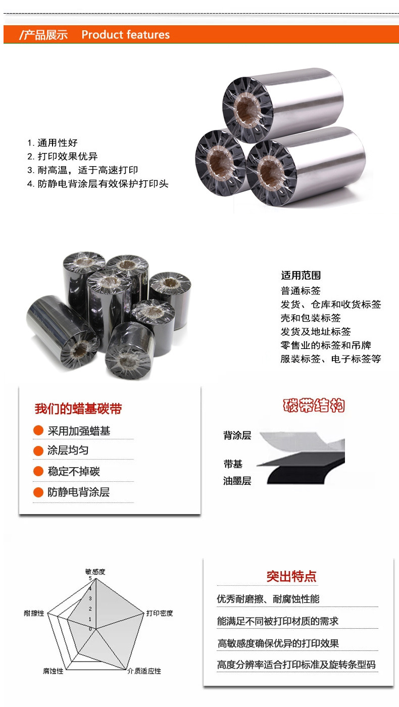 标准蜡基碳带产品特点:广泛的标签适应性,通用性好,打印效果优异,成本经济,耐高温,可适用于高速打印。适用范围广,可适应不同被打材质。防静电背涂层易于有效保护打印头。适用场合:发货、仓库和收货标签 外壳和包装标签零.售业的标签和吊牌 服装标签等适用介质:涂层纸标签和吊牌(热转印纸、普通铜版纸)聚乙烯薄膜(PE)聚丙烯薄膜(BOPP)存放:为了保证最好的性能,请按如下的环境要求使用、运输和存放碳带使用环境: 5℃-35℃,45%-85%的相对湿度运输环境:-5℃-45℃,20%-85%的相对湿度,时间不多于一个月存放环境:-5℃-40℃,20%-85%的条件下存放,不能多于一年注意:将碳带直接暴露在阳光和潮湿的环境下将对碳带产生损坏碳带规格:常规宽度(mm):40、50、60、70、80、90、100、110常用长度(m):300碳带卷向:外碳、内碳碳带轴心:1英寸、1/2英寸。小卷心适用于:ARGOX ZEBRA INTERMEC品牌的商业机。大卷心适用于一切工业型机器或TSC GODEX等品牌机,如果不了解碳带使用卷心,请联系店主了解详情;注:可定做各种非常用规格碳带。