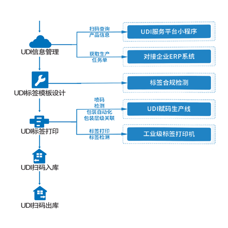 医疗器械全生命周期流程监管,UDI务平台通过UDI数据实现完整的产品数据链条追溯,协助企业快速高效建立满足国家市场监管与国药监医械监管的追溯平台。